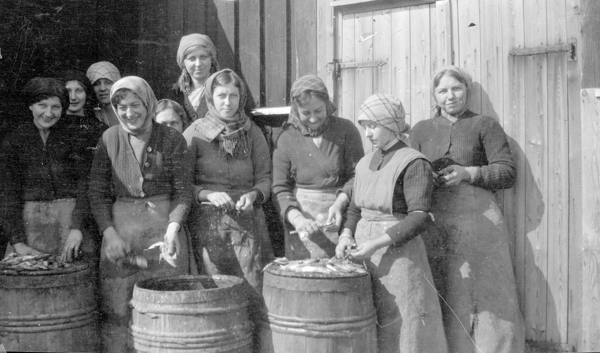 "Sillkvärkning" i Smögen april 1915. Kvinnliga fiskearbetare står vid tunnor med sill.