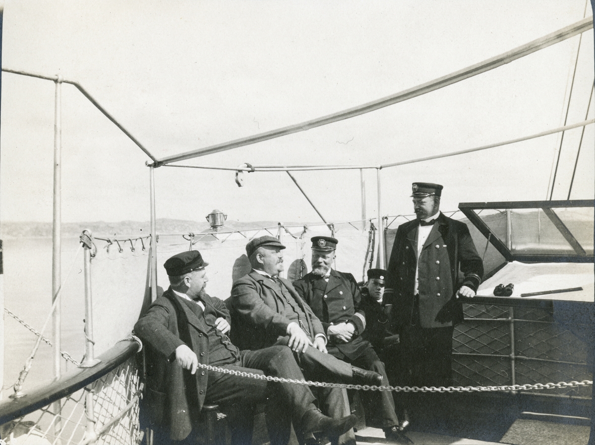Fem personer som slappnar av uppe på S/S Aeolus kommandobrygga. Mannen längst till höger är förmodligen Viktor Emanuel Nyman, Alf Nymans far.