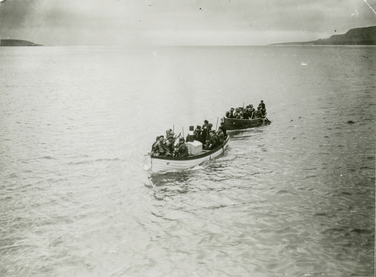 'Lilla Aeolus' (Aeolus barkass) bogserar en roddbåt. Förmodligen är människorna i bilden medlemmar ur den 11:e geologiska kongressen som återvänder till Aeolus efter en utförd exkursion någonstans på Svalbard.