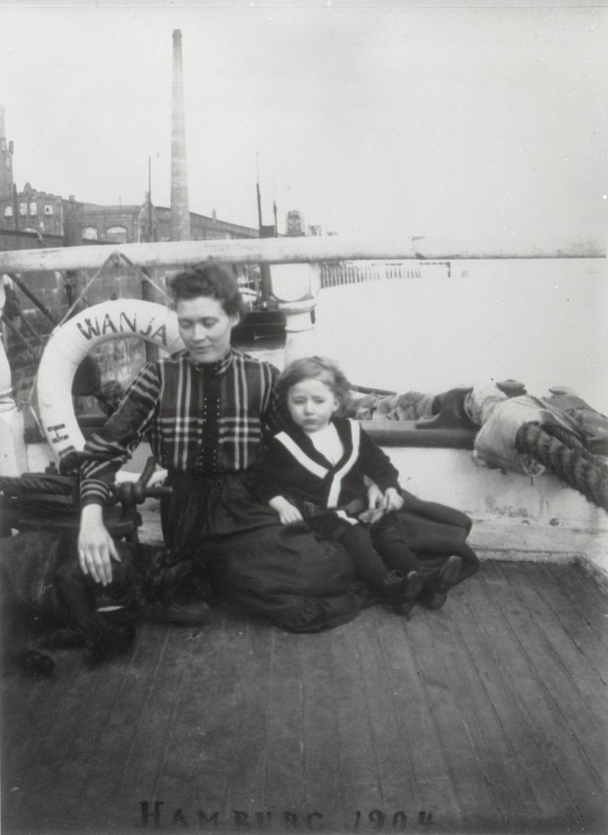 "Ombord på Wanja, Cuxhaven 1906. Kapten Holmgrens hustru Hedvig med äldste sonen Halvar och skeppshund [...]"