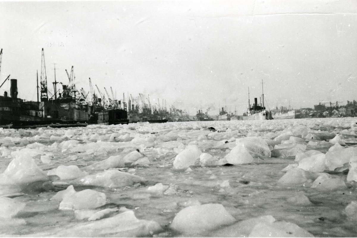 Foto i svartvitt visande en del av hamnen i Göteborg. Foto från pålverket åt V.