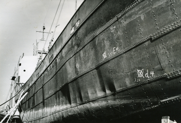 Holms skeppsvarv. S/S Veleda från Bremen repareras för skador genom isskruvning, 1956.