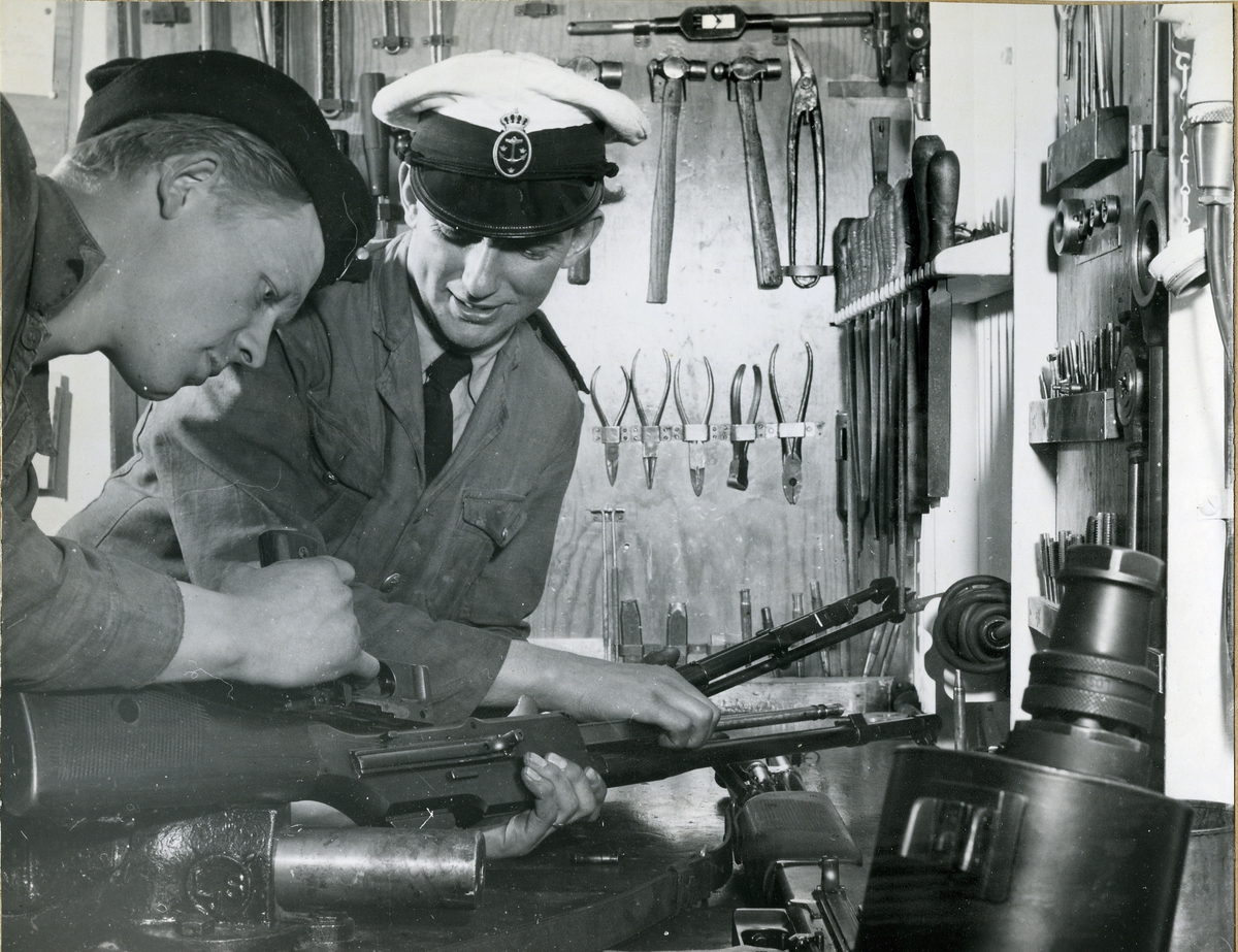 Ett kulsprutegevär m/37 får översyn i vapenverkstaden.
