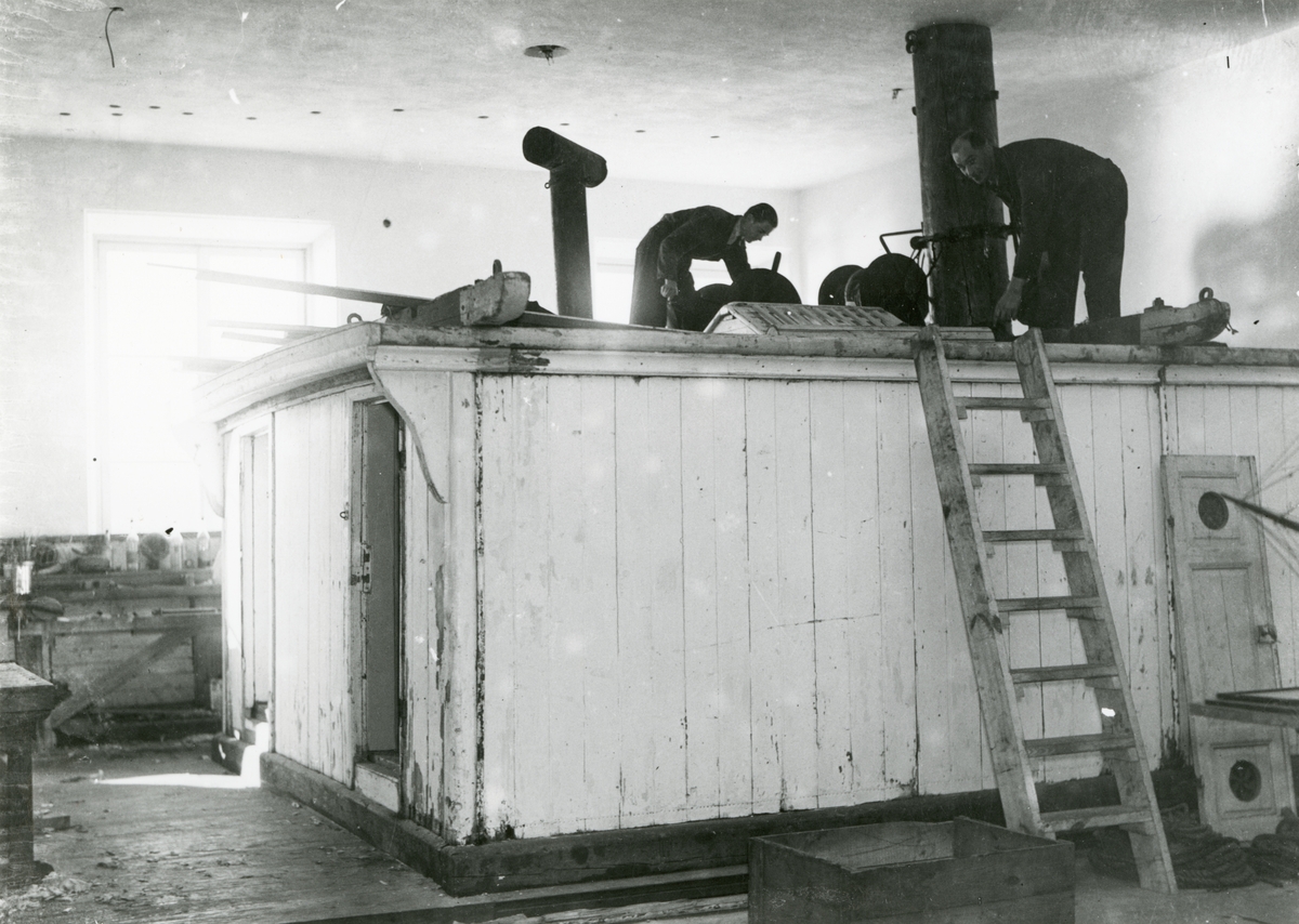 Samlingarna under uppordnade 1935. Utställningen i Sjöfartsavdelningen. Skansen från skonertskeppet HOPPET monteras upp av museets personal.