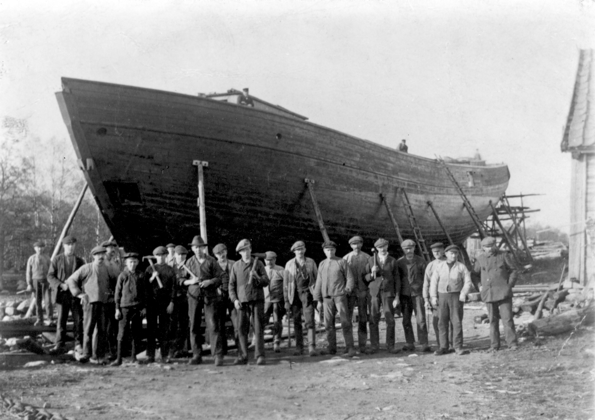 Fredriks Jonssons varv 1918. 3 msk Göta, 198 br.reg.t. under byggnad. I förgrunden varvspersonalen. Längst t.h. varvsägaren och byggmästaren Fredrik Jonsson.