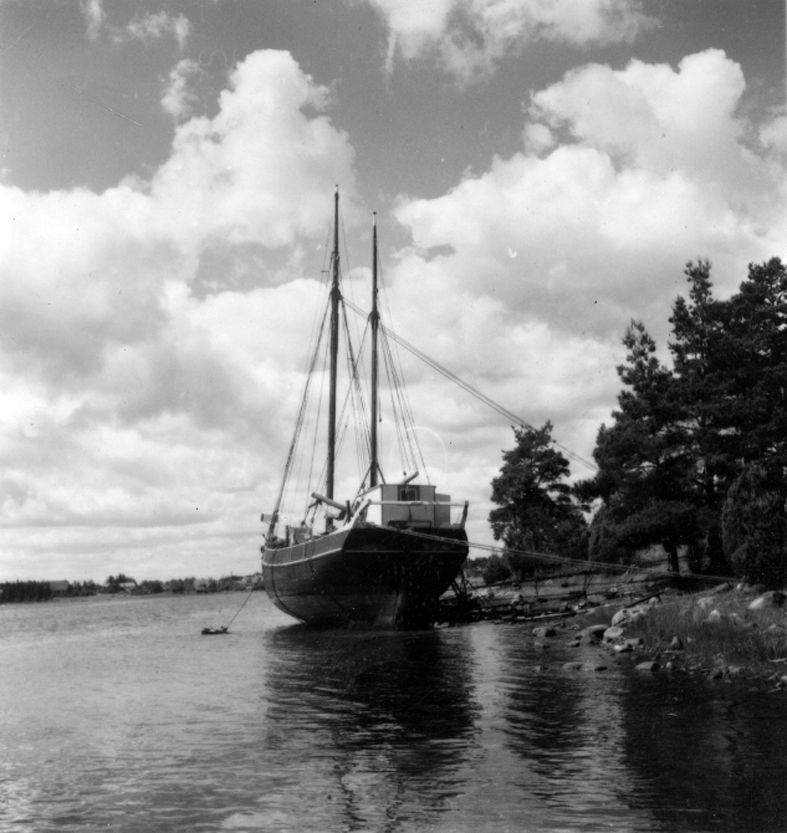 Småland, Kalmar län, Stranda härad, Ålems socken, Timmernabben. Galeasen Nils av Borgholm upptagen på tillfälligt iordningställd slip på Landsholm utanför Timmernabben för insättning av större motor. Arbetet utföres och slipen har gjorts av de båda sjömännen Albin Karlsson, 73 år och Arvid Karlsson 68 år.