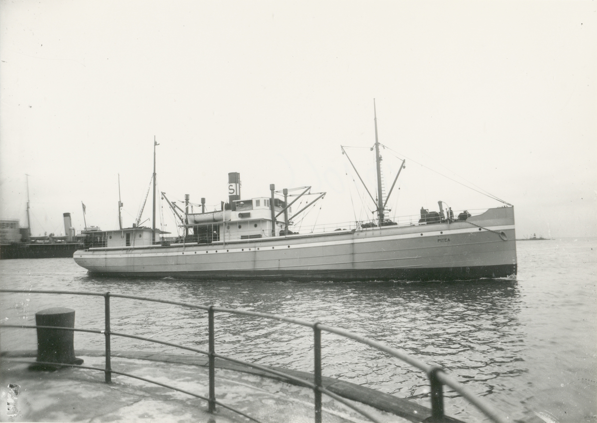 Foto i svartvitt visande [passagerar & ] lastångfartyget Piteå av Stockholm i Köpenhamn.