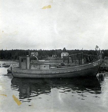 Fiskebåten GE 16, byggd av Thure Axelsson i Gudinge 1951, liggande(s) i Mellanfjärdens fiskeläge.
