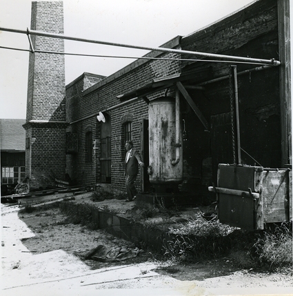 Holms skeppsvarv. Pann- och vinschhusets nordsida sett från väster. I förgrunden th bas-kistan med lucka av järnplåt. Skåne, Malmöhus län, Råå.