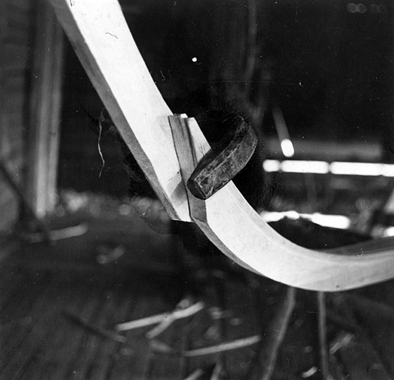 Neg nr 75. Framskarven fastskruvad för passning och uppmärkning av fog. Kölens övre avslutning har med kniv täljts och putsats för fogen med framskarven. En liten tand har sparats ut upptill. Foto 6.8 (1962).