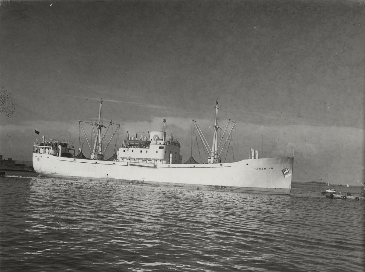 Foto i svartvitt visande lastmotorfartyget "TORSHOLM" i Köpenhamn under 1950-talet.
