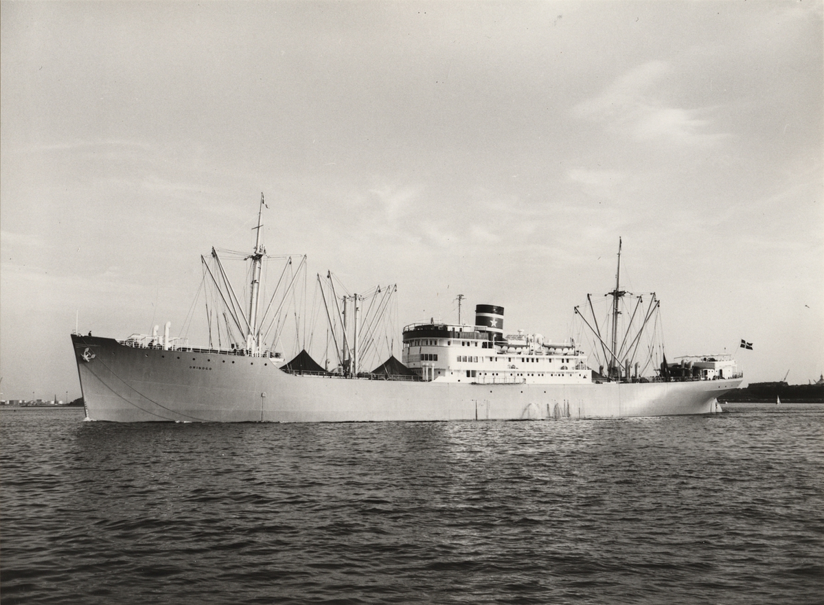 Foto i svartvitt visande lastmotorfartyget "ORINOCO" i Köpenhamn.