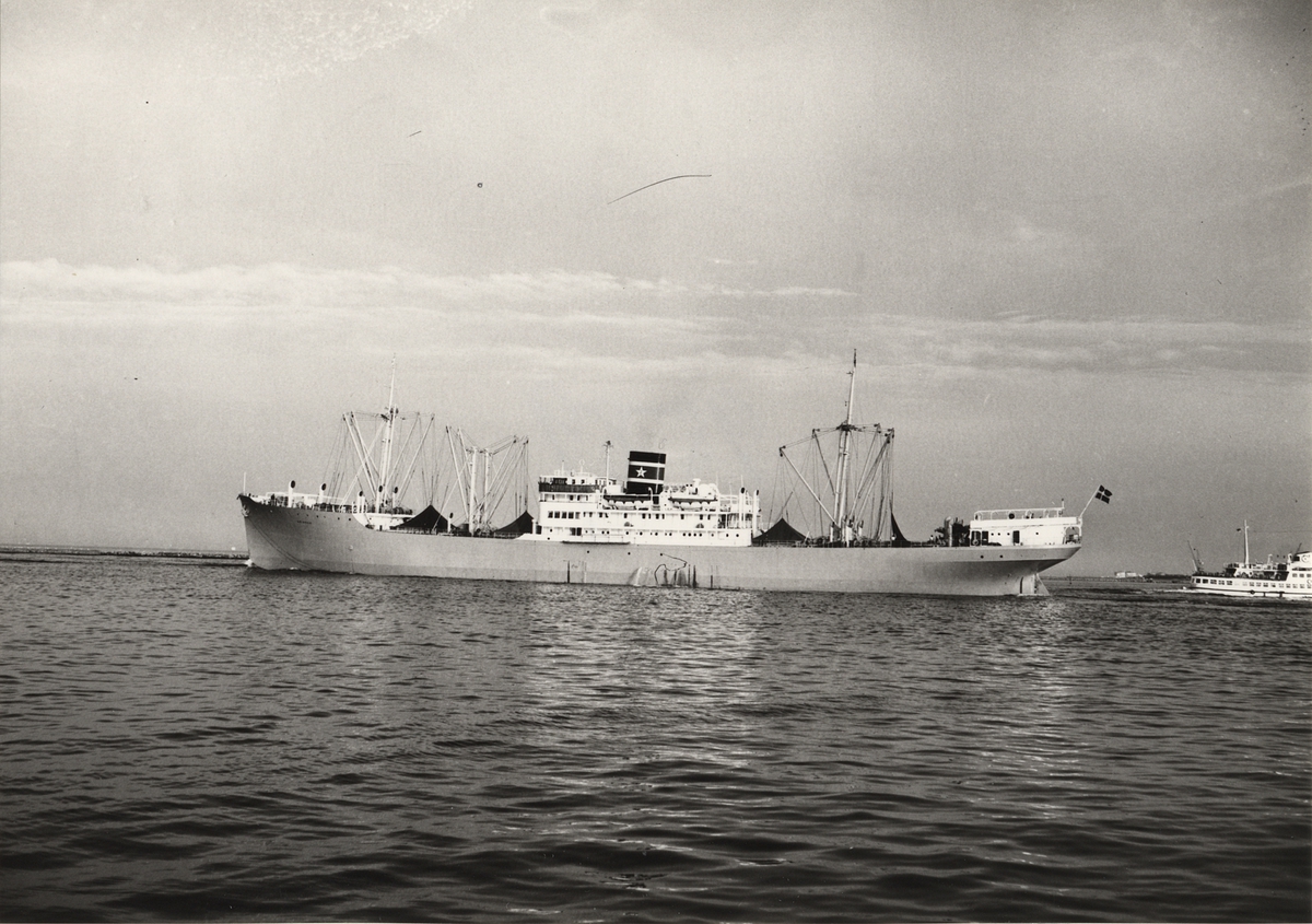 Foto i svartvitt visande lastmotorfartyget "ORINOCO" i Köpenhamn.
