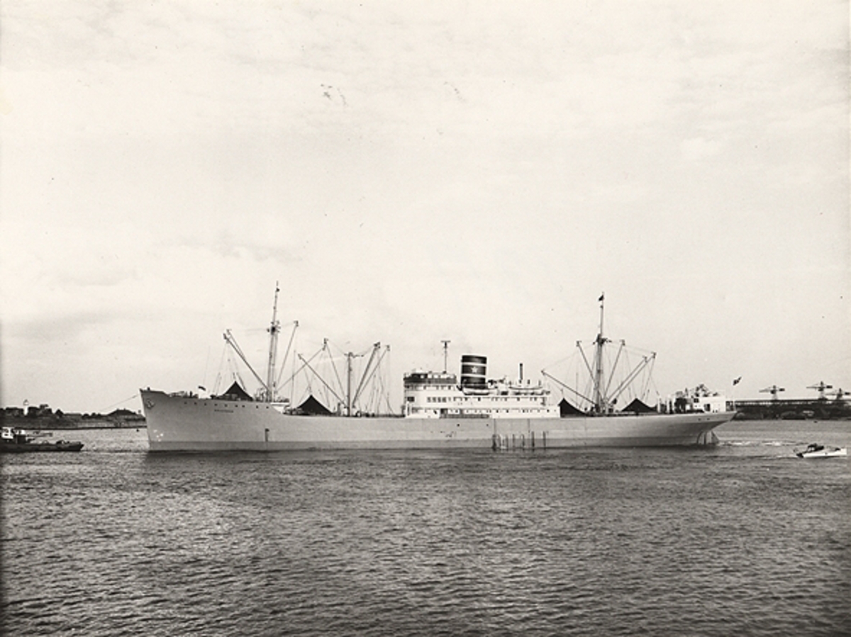 Foto i svartvitt visande lastmotorfartyget "AMAZONAS". Foto från Köpenhamn år 1960.