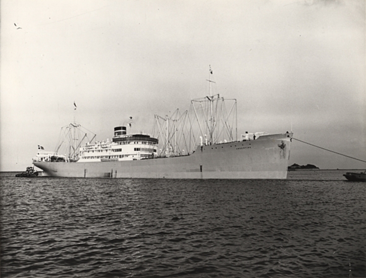 Titel: Foto i svartvitt visande lastmotorfartyget "ARGENTINA" taget i Köpenhamn under maj månad 1961.