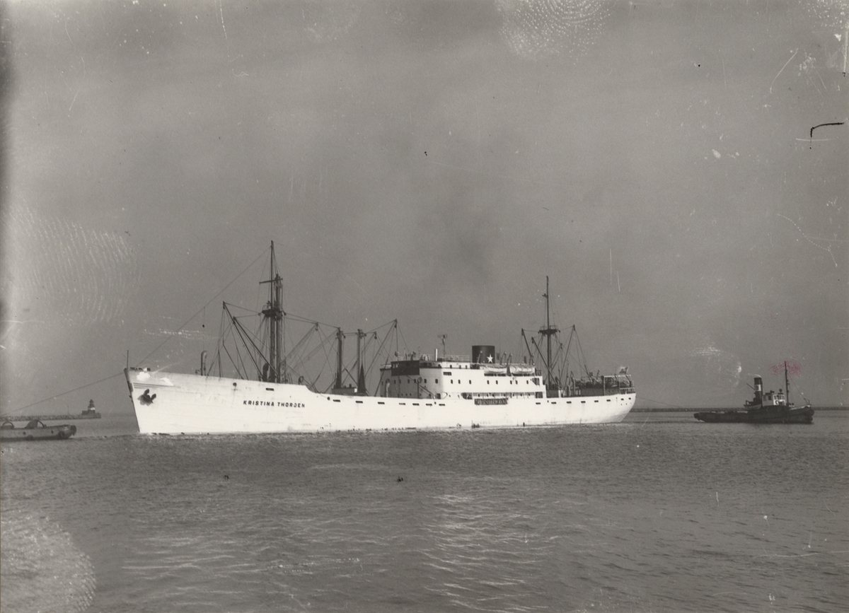 Foto i svartvitt visande lastmotorfartyget "KRISTINA THORDÉN" i Köpenhamn.