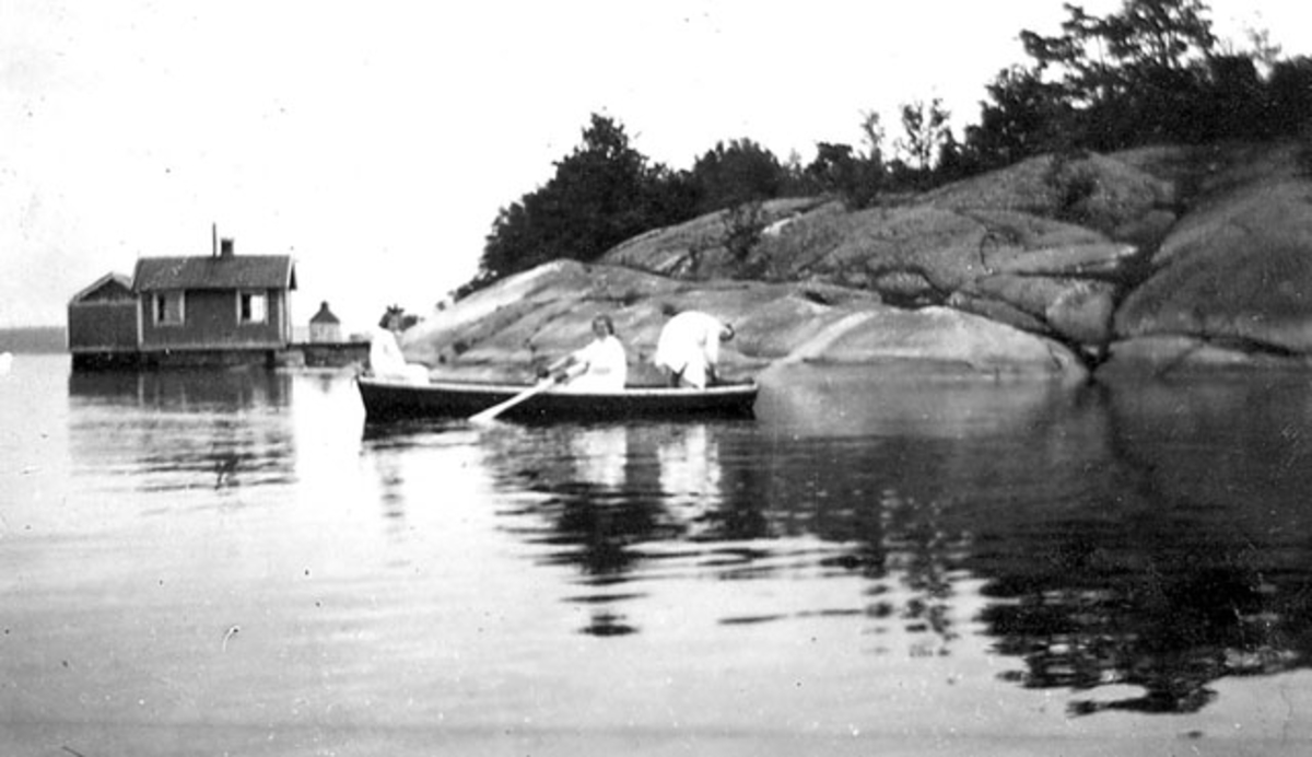 Tre kvinnor i roddbåt och badhus i bakgrunden.