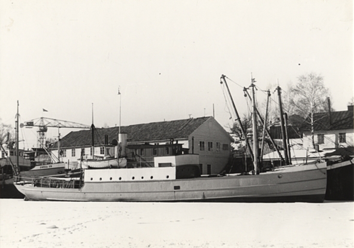 Lastmotorfartyget FROSTVIK av Stockholm liggande vid Ekensbergs varv, Stockholm, 24.3.1957.