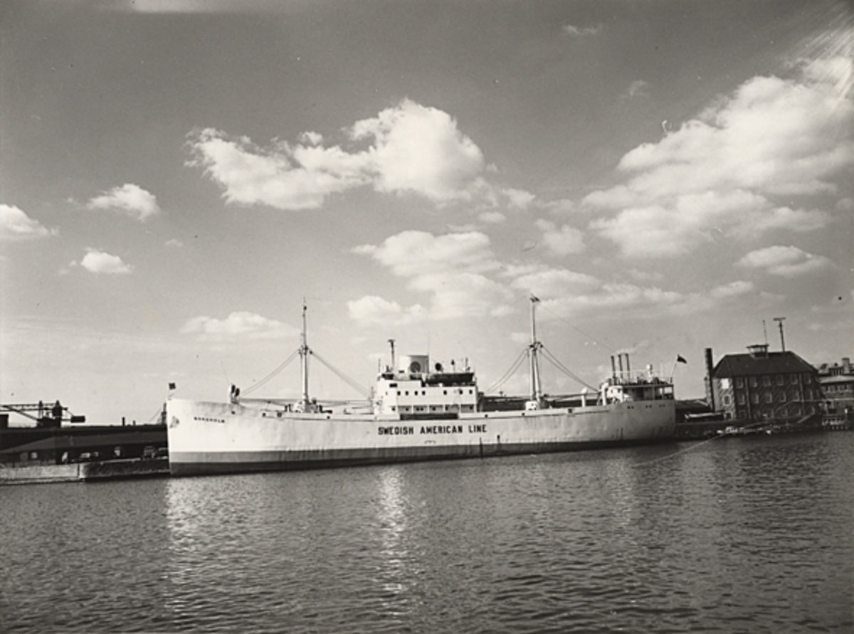 Foto i svartvitt visande lastmotorfartyget "BORGHOLM" i Köpenhamn under 1950-talet.