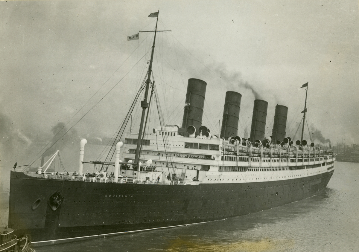 A photo of th SS Aquitania, taken as it pulled out, to go to Southampton, England.
