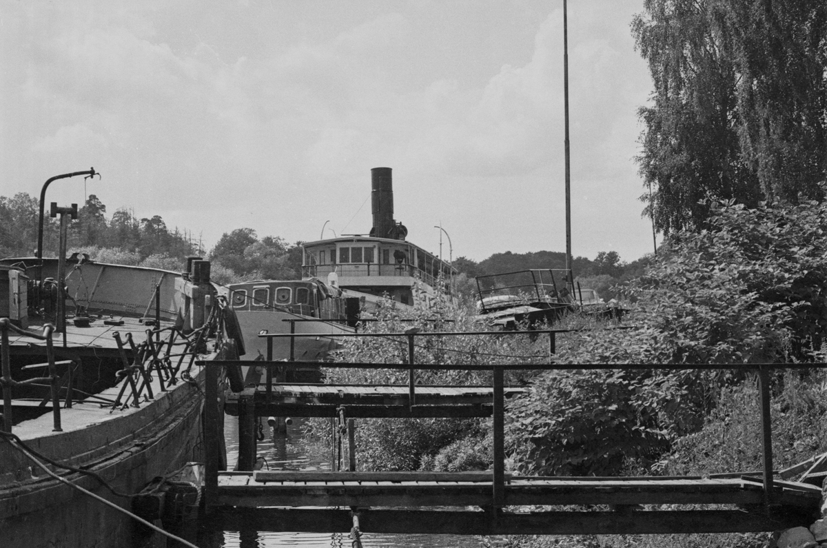 Fartyg på Ekensbergs varv 1970. I förgrunden till v varvspråmen, f d bogserbåten FLINTRÄNNAN, i bakgrunden skärgårdsbåten ÖSTANÅ I.