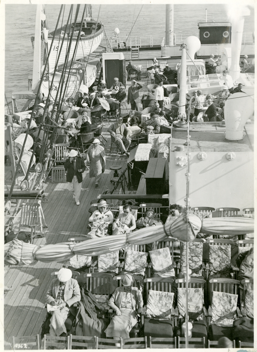 Passagerare och personal på soldäck på M/S GRIPSHOLM.