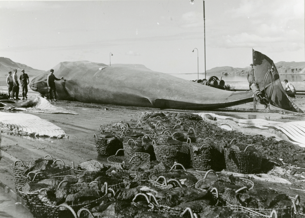 Styckning i val i Hvalfjördur Island, den 11 augusti 1948.