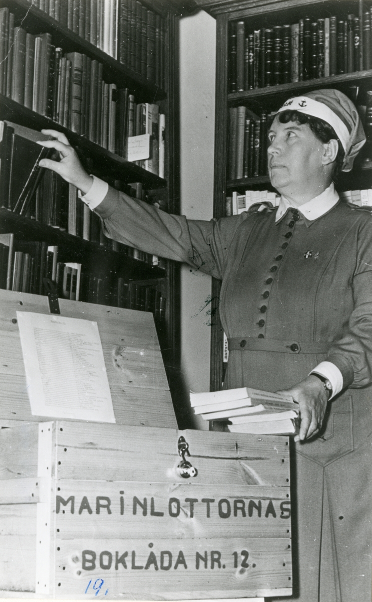 Marinlotta plockar upp böcker i ett bibliotek.