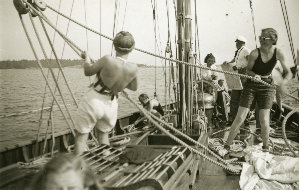 Flera arbetande kvinnor på däck. Kapten i bakgrunden.