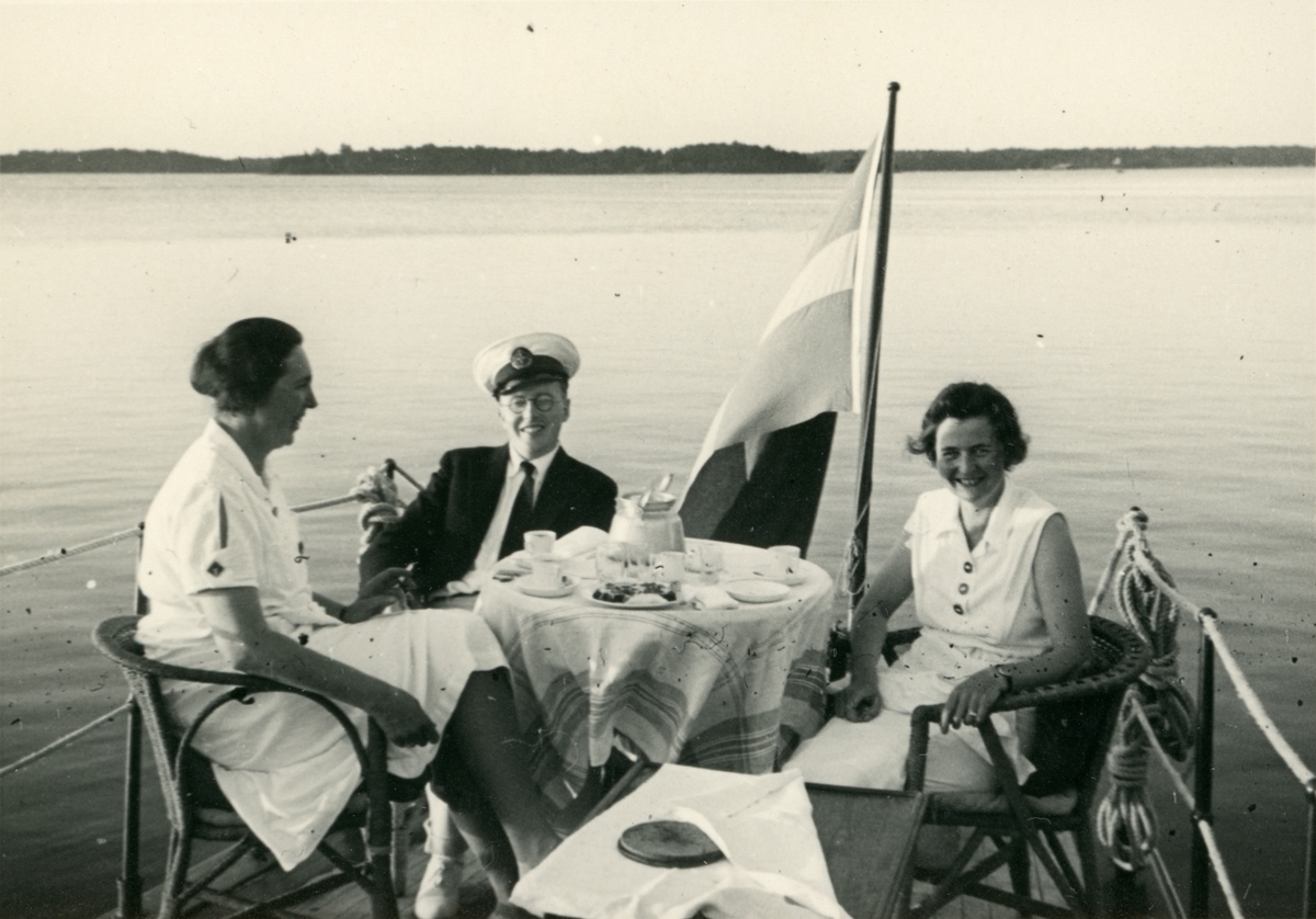 Två kvinnor och en man sitter vid ett dukat bord i aktern på en båt.