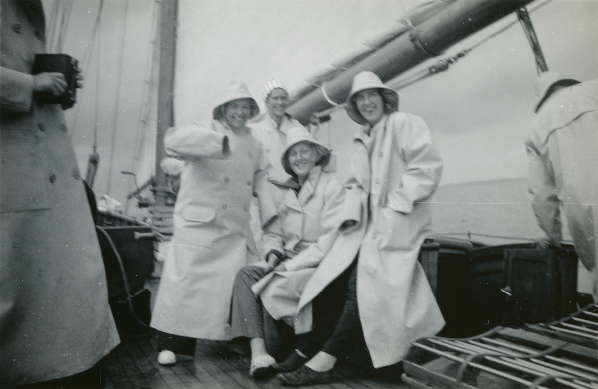Kvinnor i regnkläder blir fotograferade på däck.