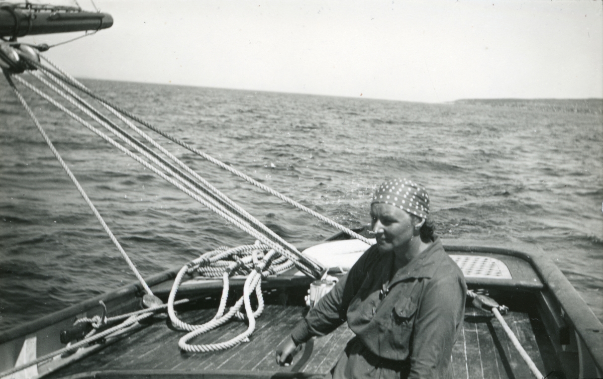 Kvinna klädd i prickig sjalett sitter i aktern.