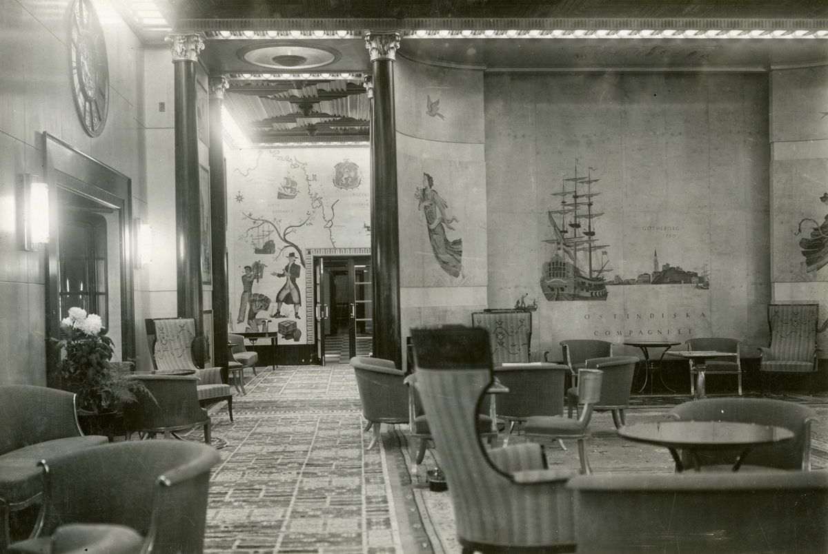 På väggarna konstverk av Jerk Werkmäster och Rolf Engströmer som skildrade Göteborg under Ostindiska kompaniets glansdagar.
