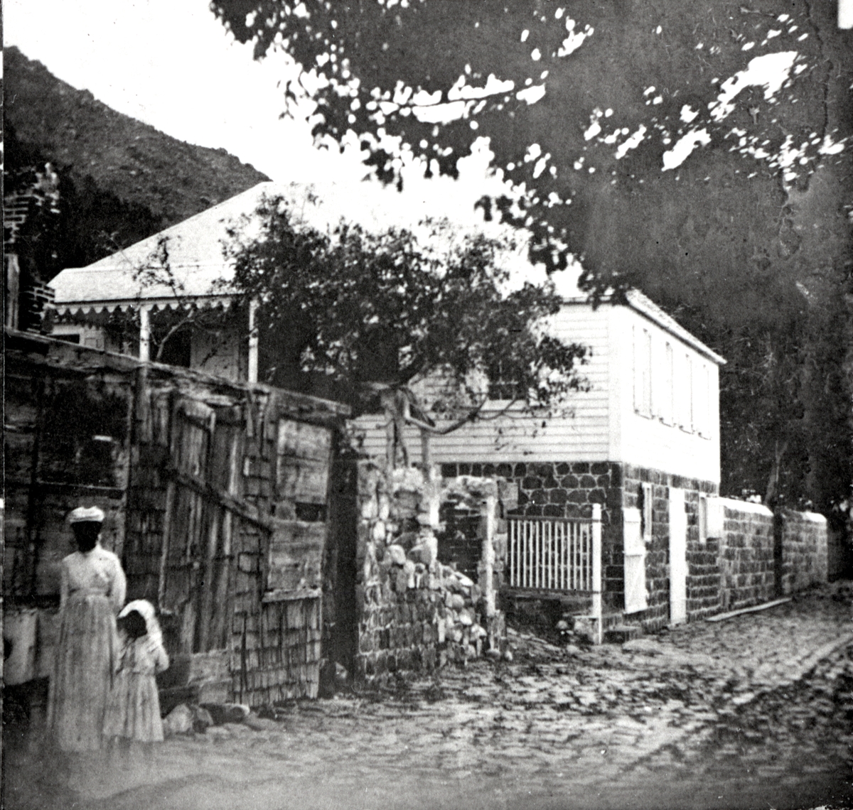 Gatubild från Gustavia. En kvinna med barn står utanför ett bostadshus.