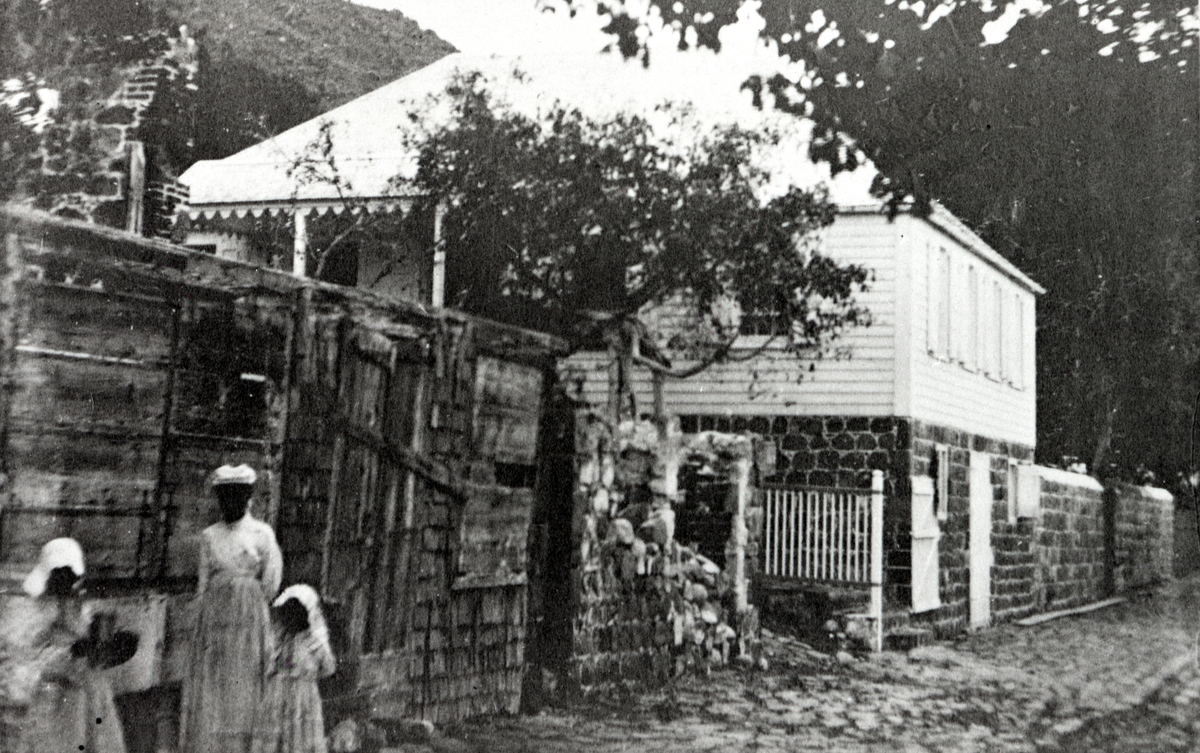 Gatubild från Gustavia. En kvinna med barn står utanför ett bostadshus.
