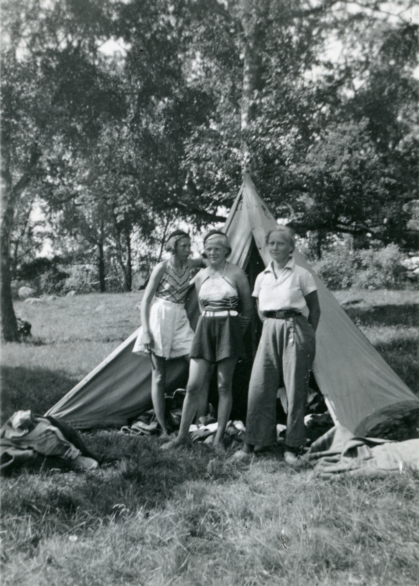 Tre unga kvinnor framför ett tält i naturen.