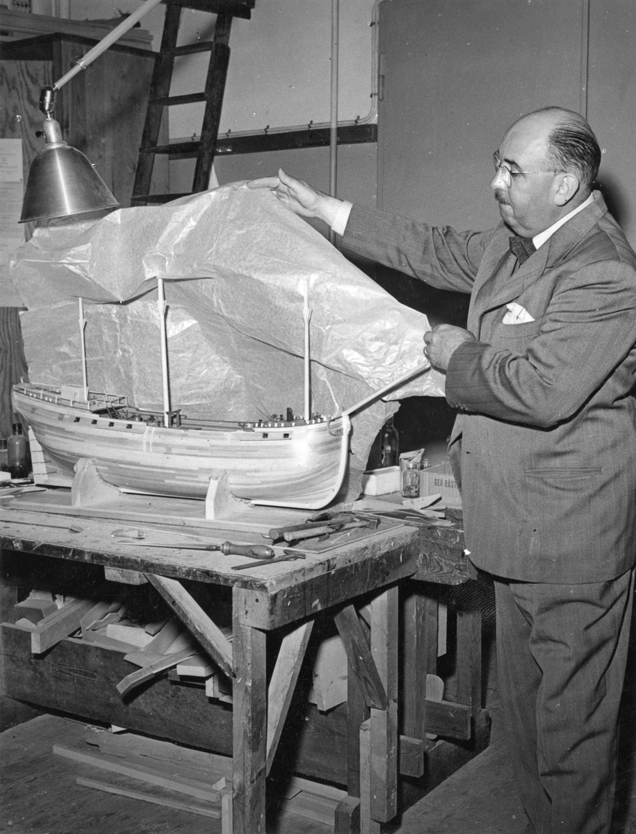 Sjöhistoriska museets modellverkstad. Museidirektör Gerhard Albe förevisar modellen av kattskeppet BARON ANDERS von HÖPKEN under byggnad.