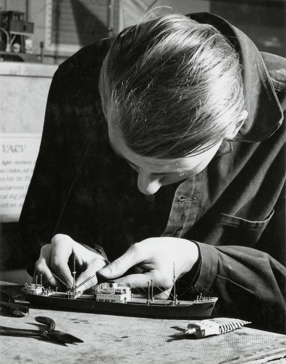 Sjöhistoriska museets modellverkstad. Modellbyggare Göran Forss arbetar på en modell av ett lastfartyg.