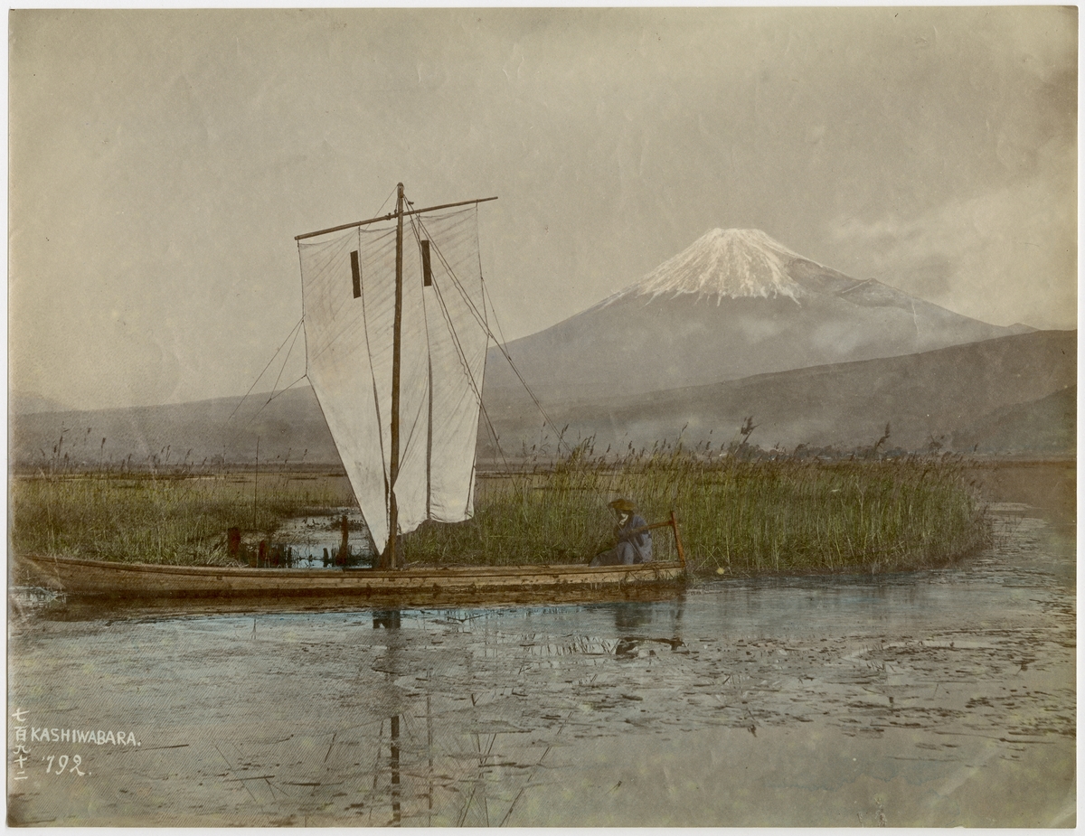 Ett kolorerat fotografi föreställandes ett landskap i Japan, troligen Mount Fuji.