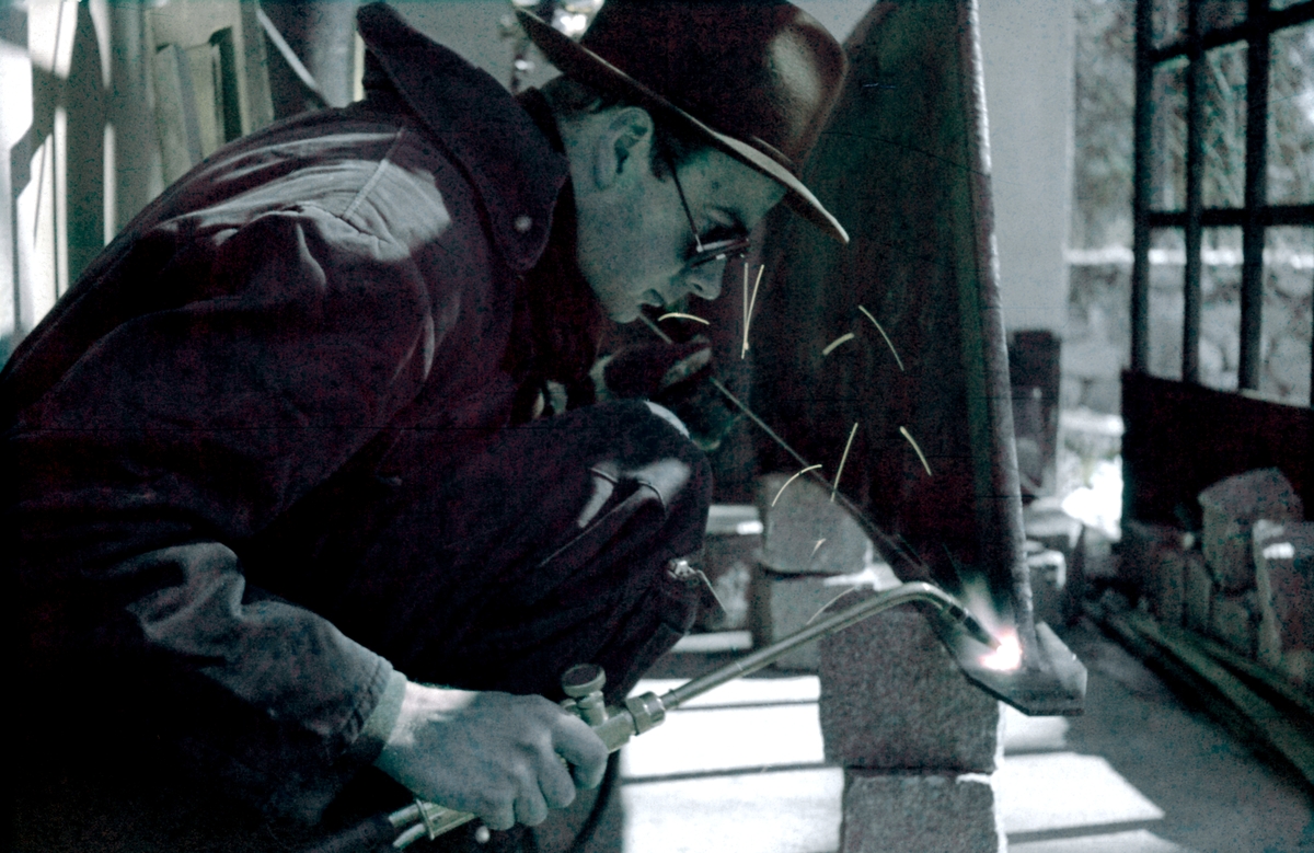 Holger Marcus i arbete med att svetsa en detalj på kölen till segelbåten DECIBEL.