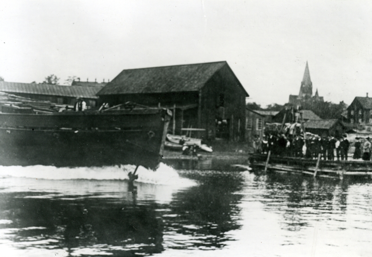 Stapelavlöpning. T.v. rundhultsbod, Åskådarna stå på brobänk Nr.18.
