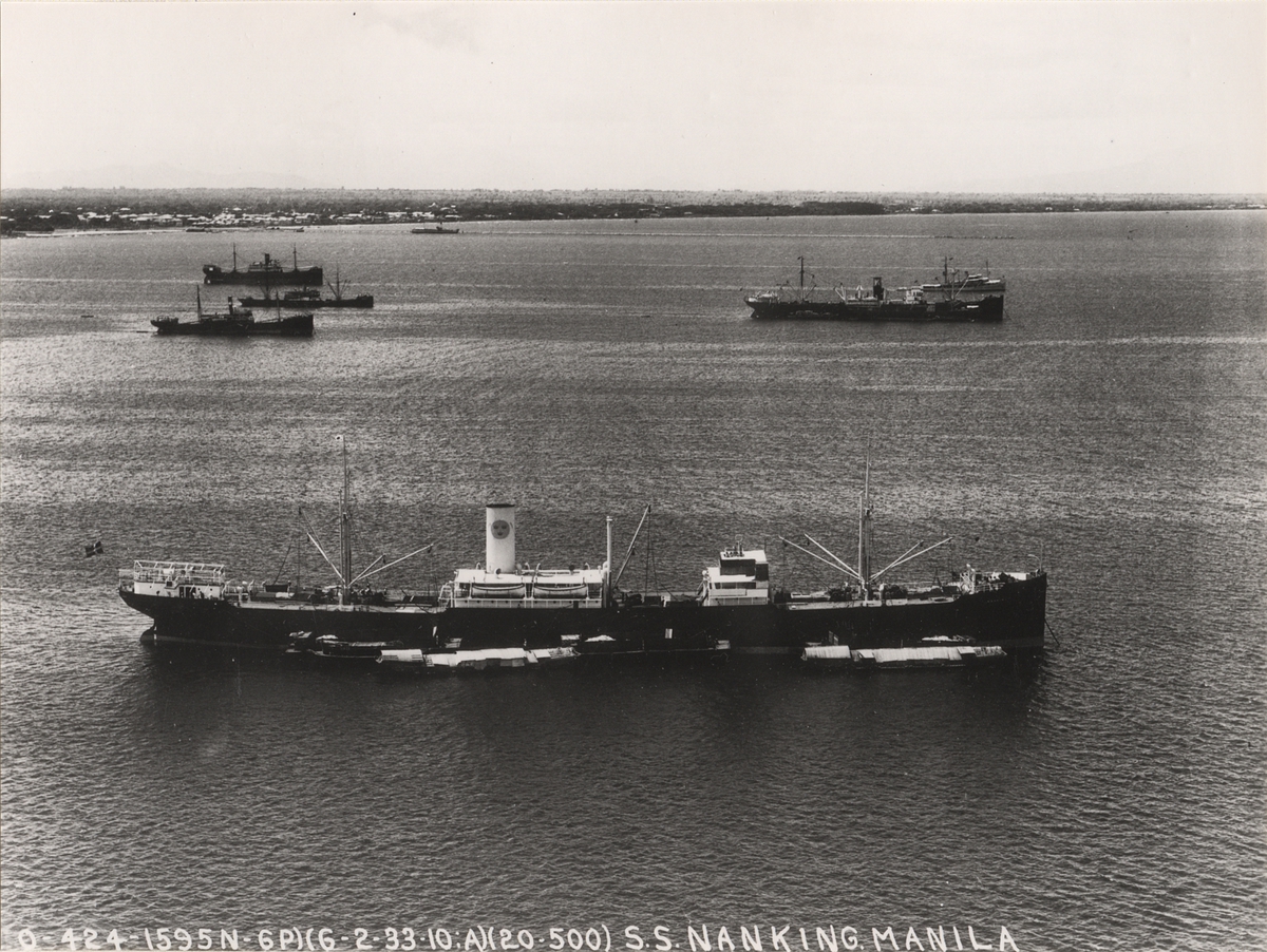 Lastmotorfartyget NANKING av Göteborg lastar kopra från pråmar på redden i Manilla, 1928.