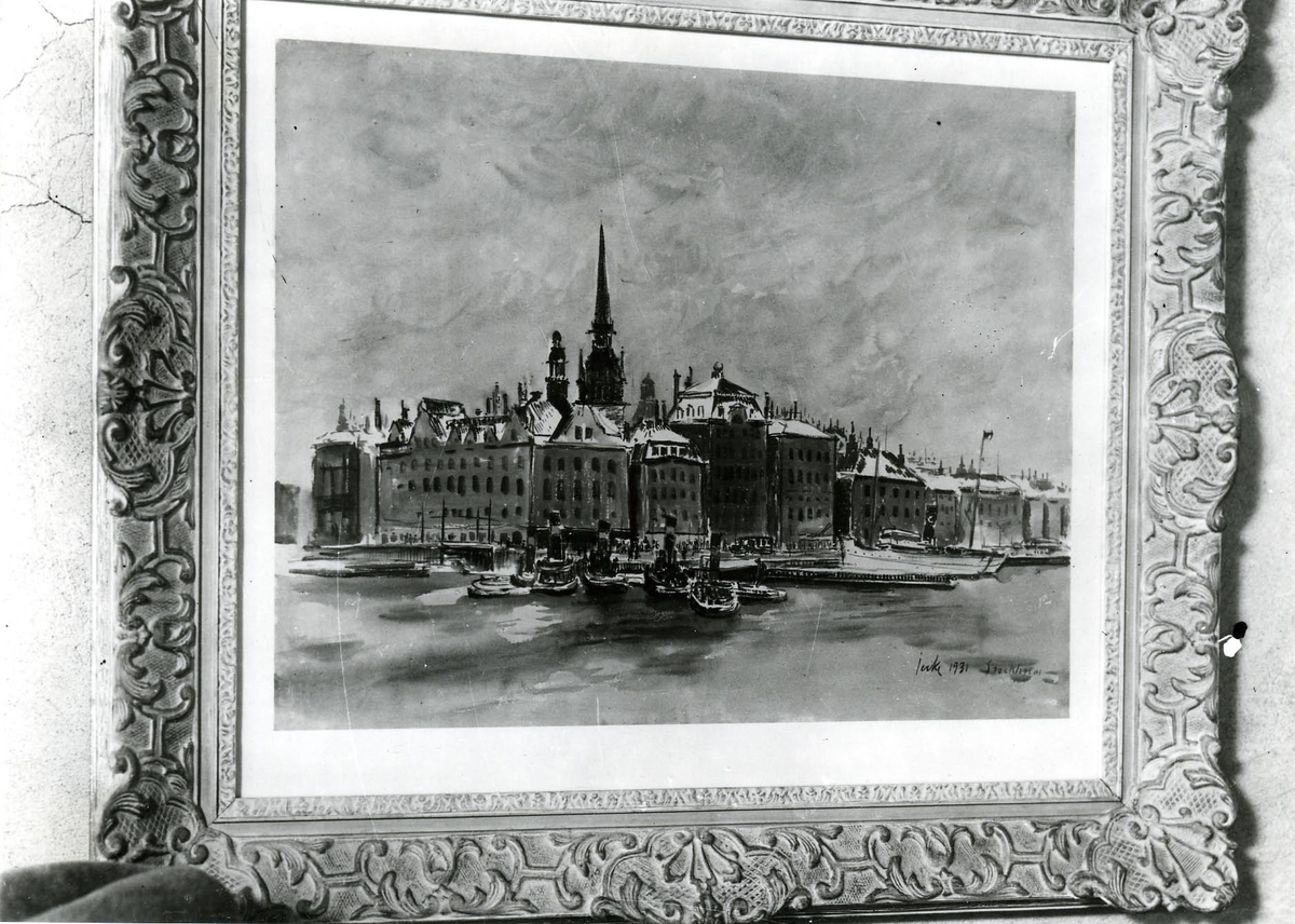 Skeppsbron vid Slussen. Oljemålning signerat: Jerke 1931, Stockholm.