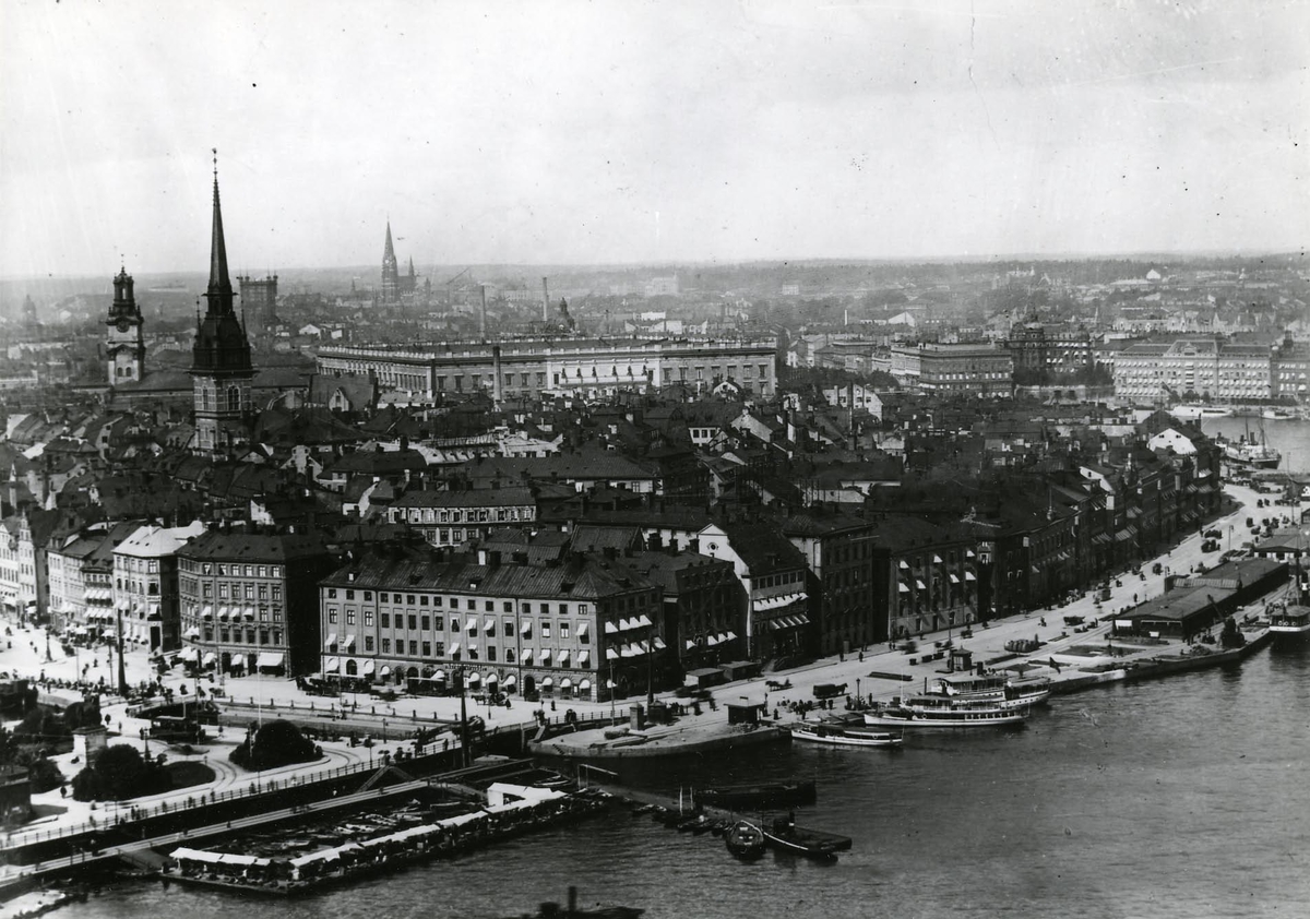 Vy över Stockholm: Slussen, Skeppsbron, Slottet, Tyska- och Storkyrkorna, taget från söder.