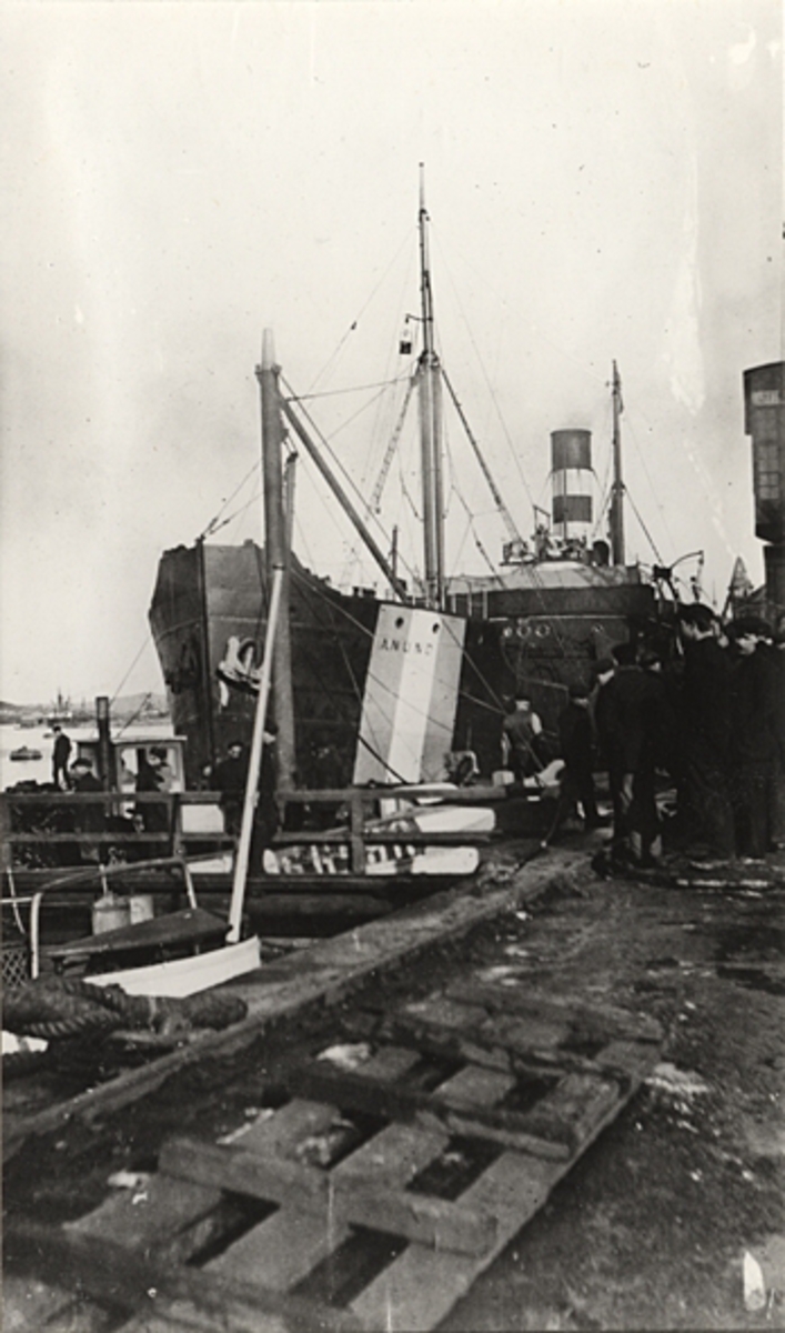 Lastångfartyget ANUND av Göteborg. Den första svenska ångaren med "neutralitetsmärket" målat, under kriget 1914-1918.