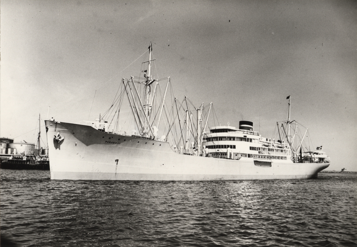 Foto i svartvitt visande lastmotorfartyget "PARAGUAY" i Köpenhamn under 1950-talet.