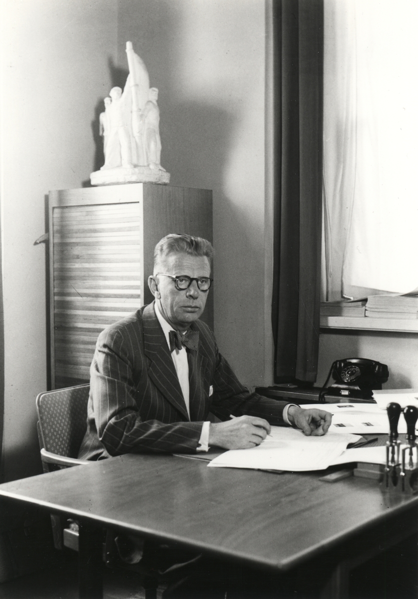 Intendent Olof Hasslöf vid skrivbordet på Sjöhistoriska museet 1952.