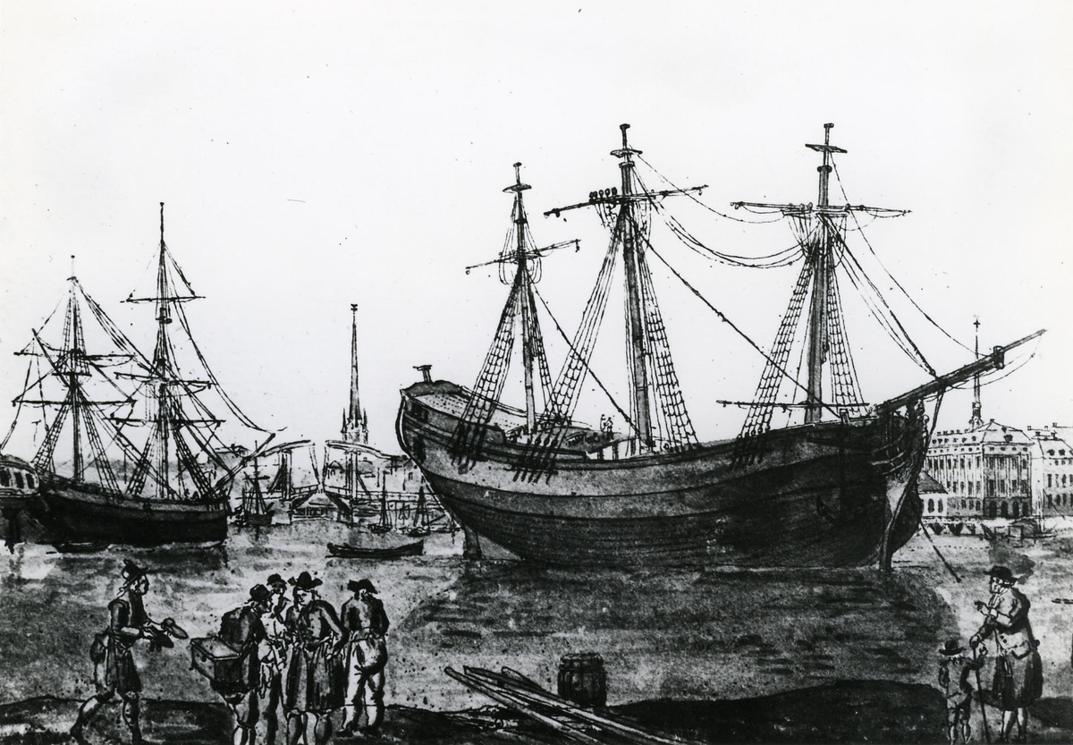 Söder ström, Stockholm. En Spanienfarare, som sedan brann upp. Efter Elias Martin 1786.