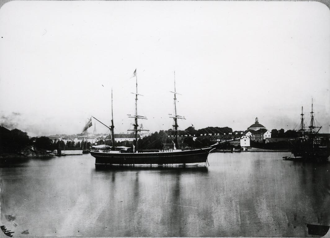 Barkskepp för ankar, till höger brigg, ävenledes ankrad, i fonden Skeppsholmen med kyrka och kaserner.