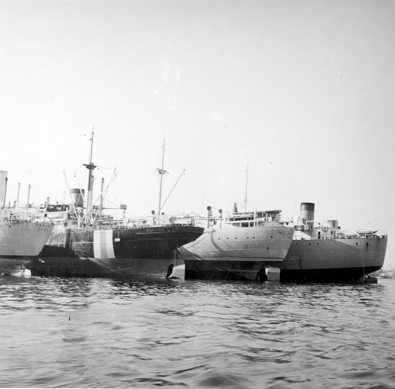 Fartyg under reparation vid Götaverken i Göteborg juni 1940. Från vänster tankmotorfartyget Ranja av Oslo, s/s Ceylon av Götebiorg, tankmotorfartyget Dicto av Oslo, m/s castor av Amsterdam(?). Fil lic Gunnar Jonssons undersökningsresa till Västkusten juni 1940.